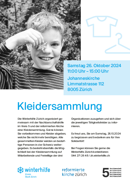Der Winter steht vor der Tür und wir holen unsere Winterkleider aus dem Keller. Wahrscheinlich merken wir alle, dass uns das eine oder andere Kleidungsstück nicht mehr passt oder wir einfach zu viele haben. Darum organisiert die Winterhilfe Zürich auch in diesem Jahr wieder ihre traditionelle Kleidersammlung.